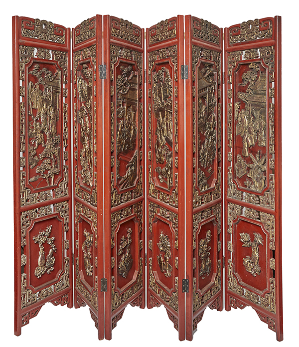The red painted six-fold screen depicting high relief scenes from "Sanguo" (The Three Kingdoms Story) painted in gilt.