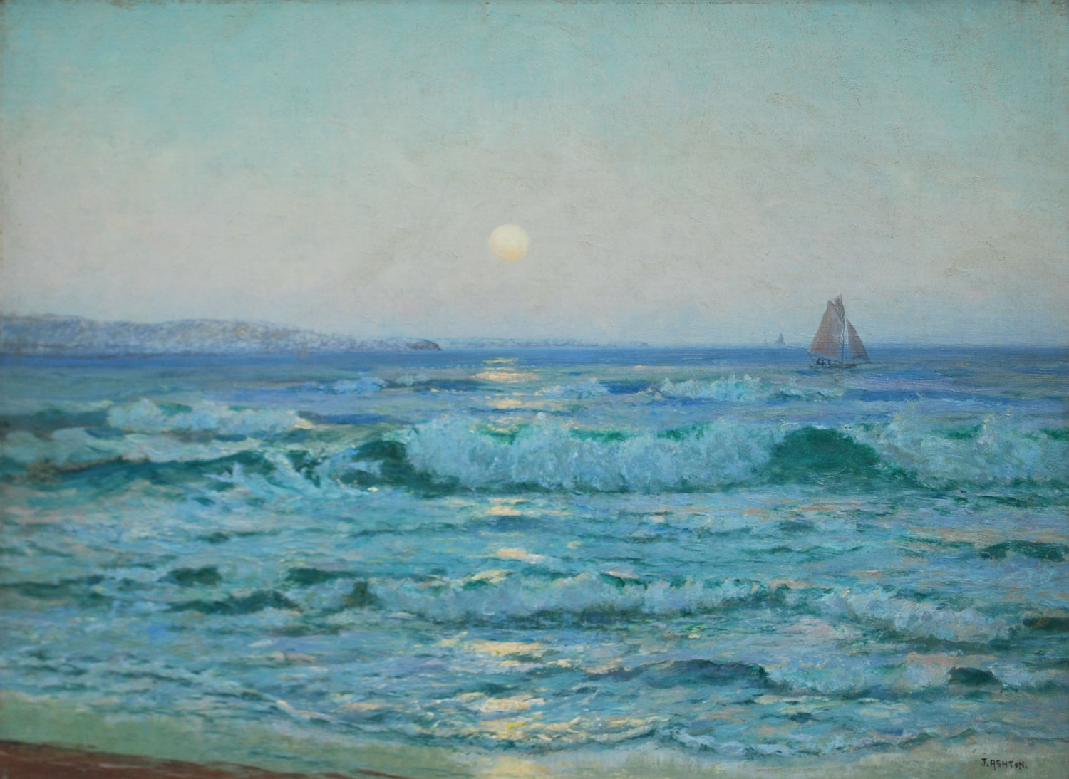 JAMES ASHTON (1859-1935), MOONLIGHT SEASCAPE, OIL ON BOARD, 44 X 59CM