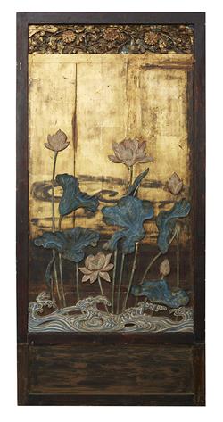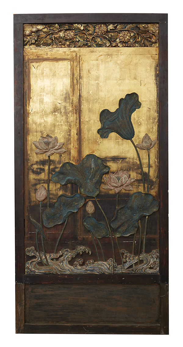 Each carved and painted with lotus leaf and flower amongst flowing water.