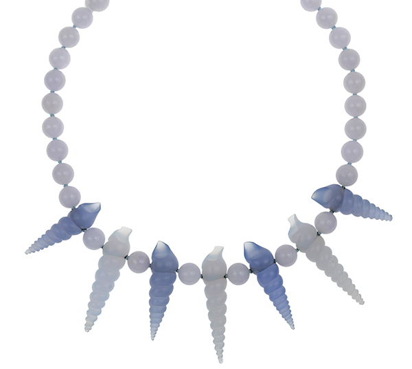 Featuring seven graduated conical shells interspaced by polished beads all of blue chalcedony in varying hues, total length 540mm.