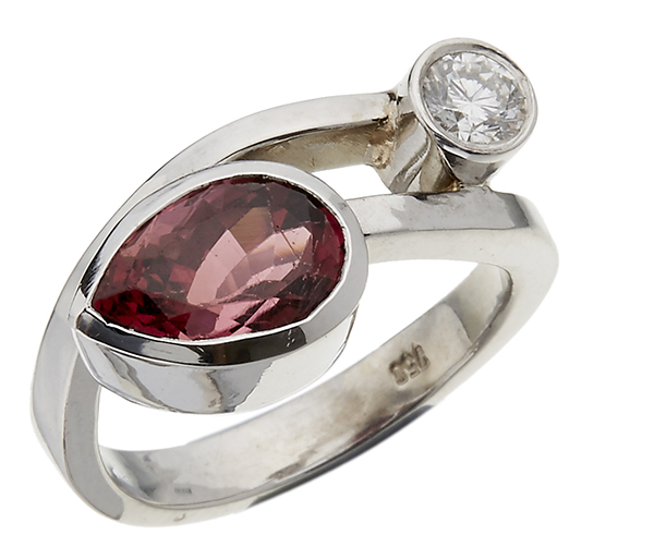 Of crossover design, set with a pear cut pink tourmaline and a round brilliant cut diamond, mounted in 18ct white gold, ring size N.