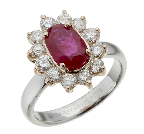 Centrally set with an oval cut ruby of 1.74cts, surrounded by round brilliant cut diamonds, mounted in 18ct rose and white gold, ring size K.