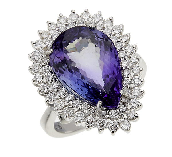 The pear shaped tanzanite of 9.10cts, surrounded by a double row of round brilliant cut diamonds, mounted in 18ct white gold, ring size N, accompanied by a GIA certificate stating colour blue violet.