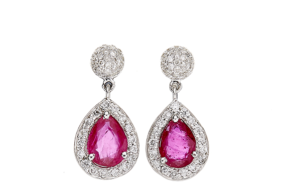Each pendant drop comprising a pear shaped ruby within a round brilliant cut diamond surround, suspended below a pavé set surmount, mounted in 18ct white gold.
