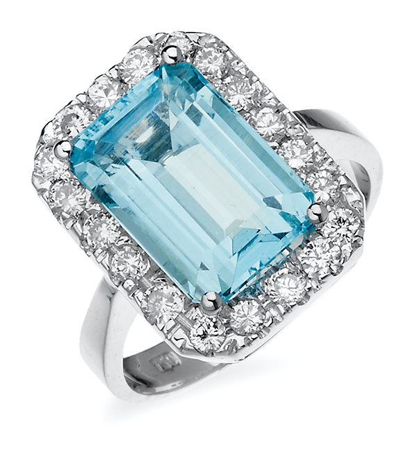 Centrally set with an emerald cut aquamarine, surrounded by round brilliant cut diamonds totalling 0.57cts, mounted in 18ct white gold, ring size M-N.