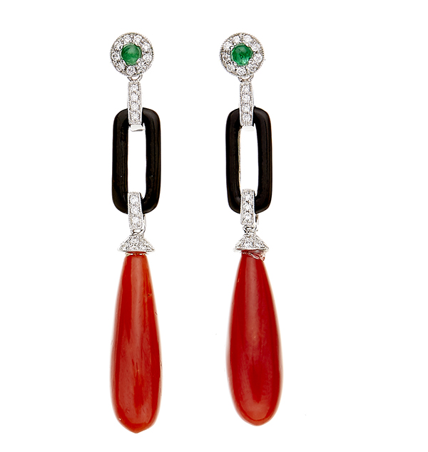 A PAIR OF CORAL, ONYX, EMERALD AND DIAMOND EARRINGS
