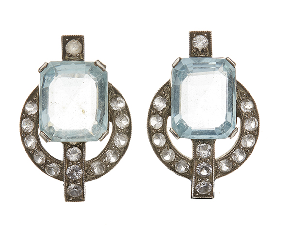 Each centrally set an emerald cut aquamarine, with white sapphire detail to the surround, mounted in gold and silver, to clip and post fittings.