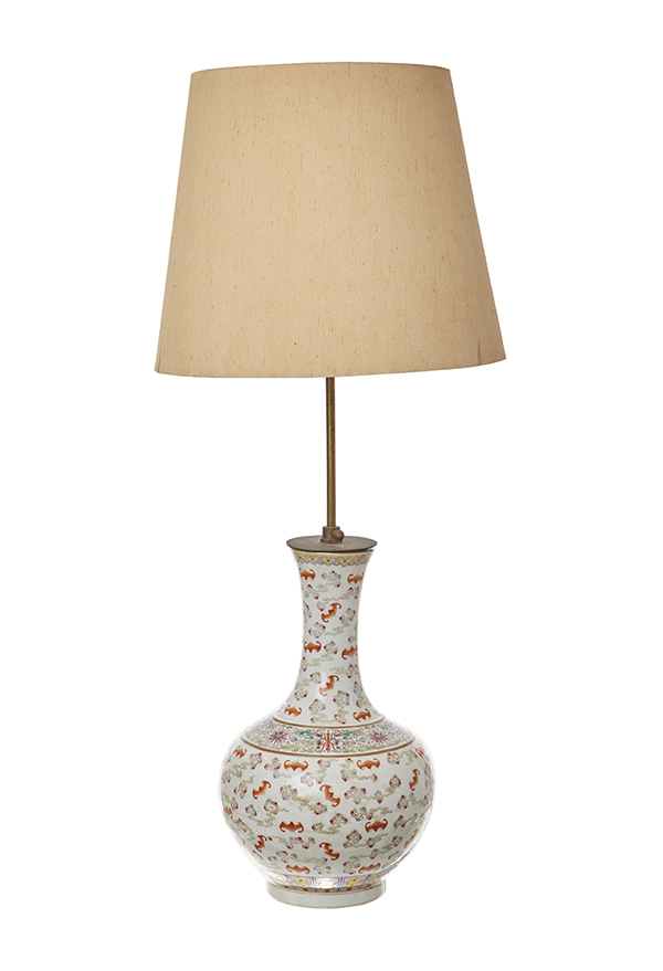 The exterior depicting bat, cloud and peony decoration, everted rim now converted to a table lamp and shade. 38cm high.