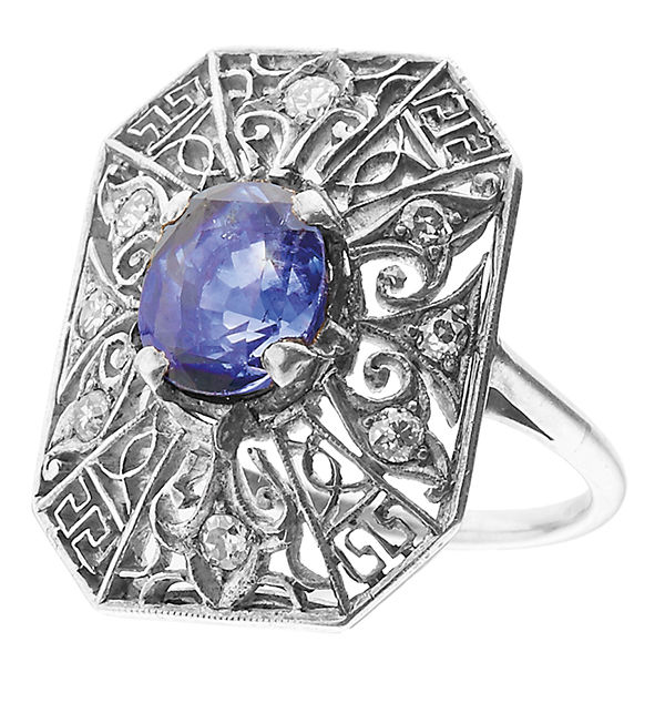A SAPPHIRE AND DIAMOND PLAQUE RING