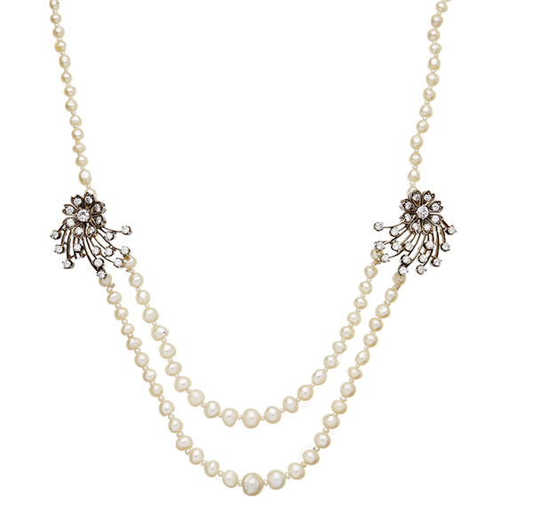Comprising a double row of graduating seed pearls with feature diamond set spray motif spacers, to single seed pearl strands and a diamond set clasp, mounted in 15ct gold and silver, total length 500mm.