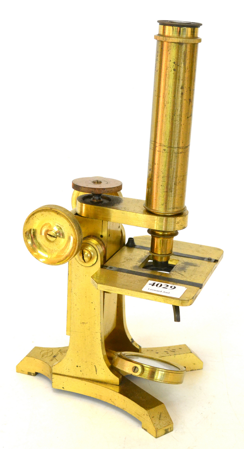 a lacquered brass foot and limb, with rack coarse focus and micrometer fine focus, plano-concave mirror on Y shaped foot, housed in portable wooden case with additional lenses, numbered 603, 29cm assembled, the case18 x 15.5cm