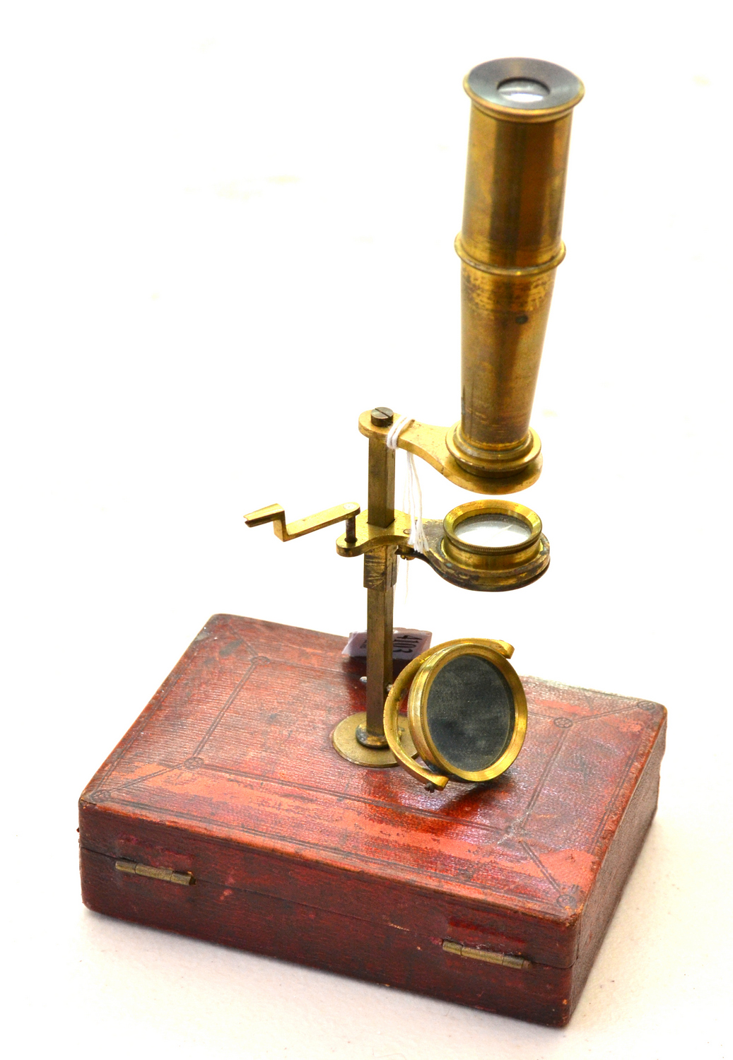 the turning column screwing in to the lid of a fish-skin covered box, the stage fitting into the socket at the top of the pillar with the objective holder above, large mirror below, the box containing two objectives and stage forceps, 3.5 x 12 x 9cm
