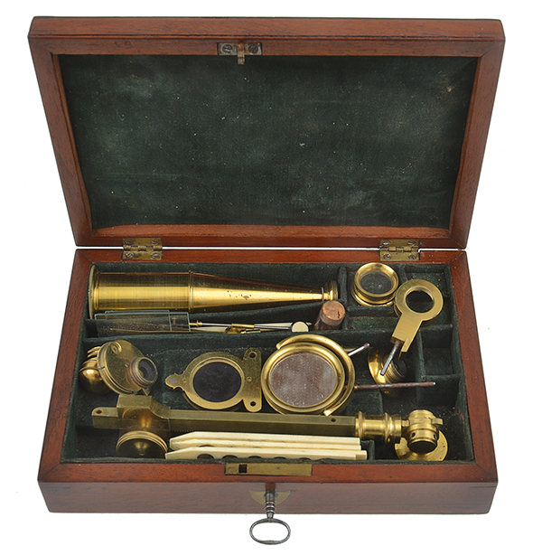 the rectangular pillar with rack focusing, the barrel tilting within 90 degrees, the whole tilting on compass joint fixed in one corner of the original velvet lined mahogany box with accessories including four bone slides with original specimens, the box 4.5 x 20 x 13cm