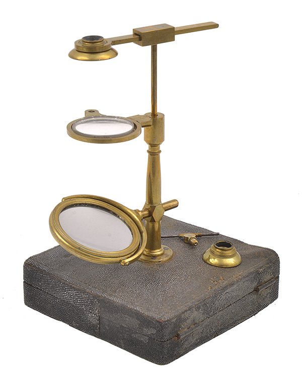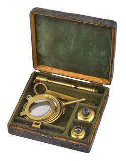 the turning column screwing in to the lid of a shark-skin covered box, the stage fitting into the socket at the top of the pillar with the objective holder above, large mirror below, the box 3 x 12 x 11.5cm