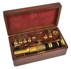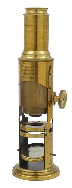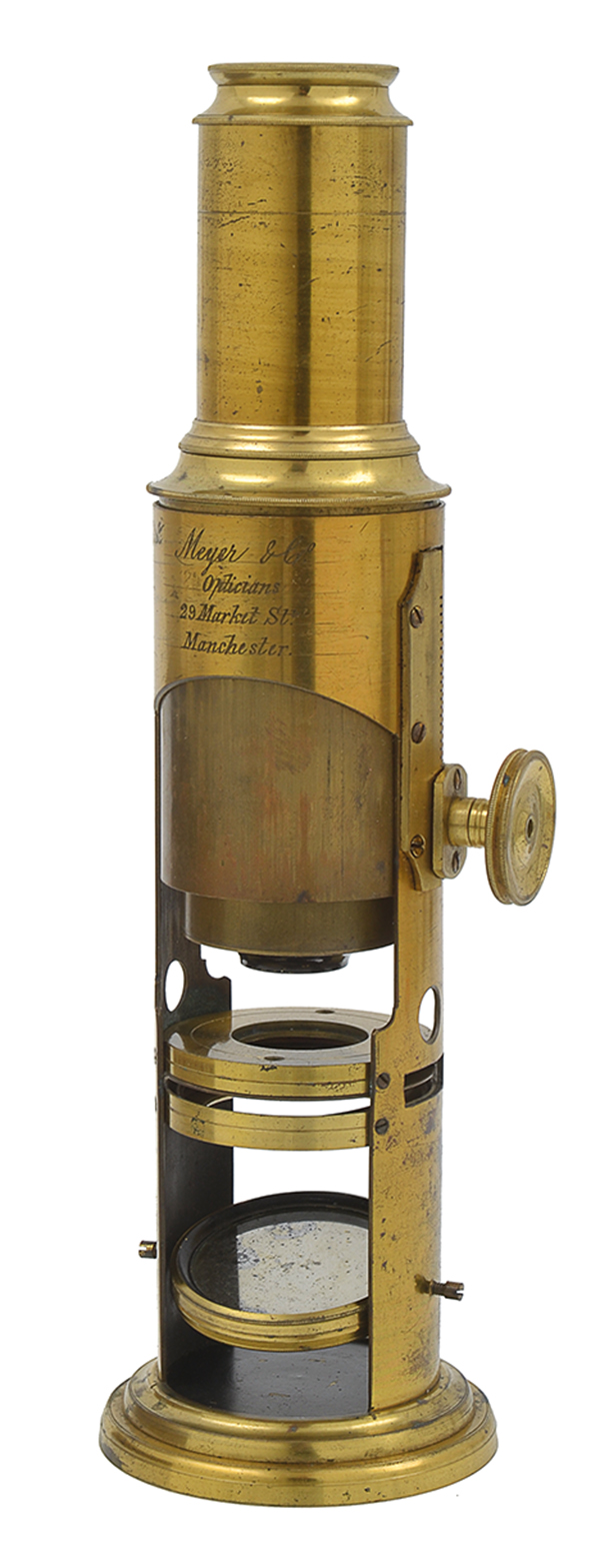 focusing by rack and pinion in original mahogany box with six numbered objectives, and a virtually complete set of accessories, the barrel signed 'Meyer & Co., Opticians, 29 Market st, Mancester', the case 10 x 27.5 x 14.5cm