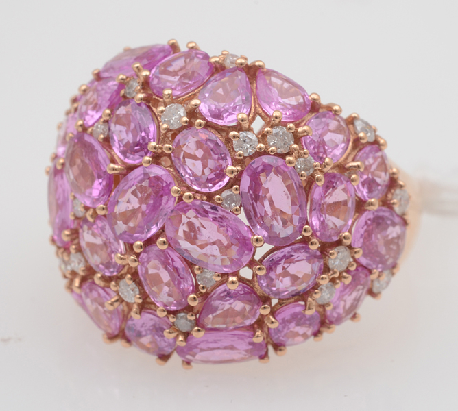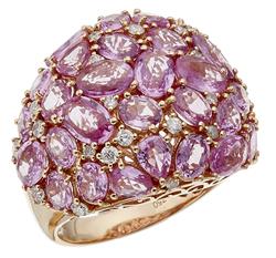 Set with pink sapphires in assorted cuts totalling 14.10cts, interspersed with round brilliant cut diamonds totalling 0.50cts, mounted in 18ct rose gold, ring size N.