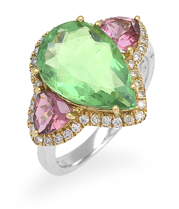 Centrally set with a pear cut green flourite of 4.16ct, flanked by two pear cut pink tourmalines and surrounded by round brilliant cut diamonds, mounted in 18ct white gold, ring size M.