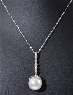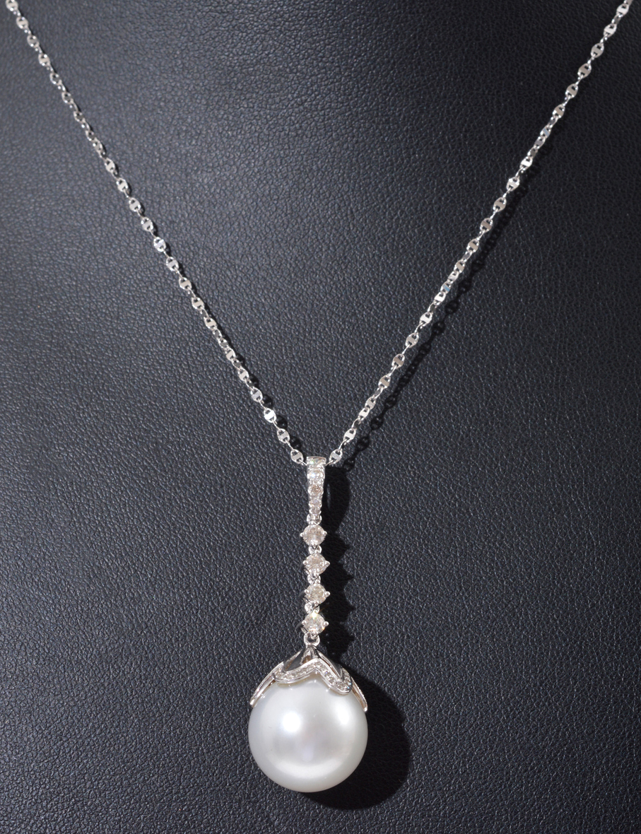 The round pearl of silver white hue measuring 14.0mm, surmounted by round brilliant cut diamonds totalling 0.50cts, set in 18ct white gold, total length 410mm.