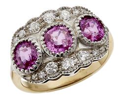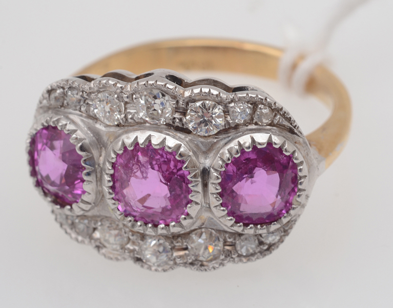 Centrally set with three round cut pink sapphires of 2.58cts, surrounded by round brilliant cut diamonds totalling 0.45cts, mounted in 18ct white and yellow gold, ring size O.