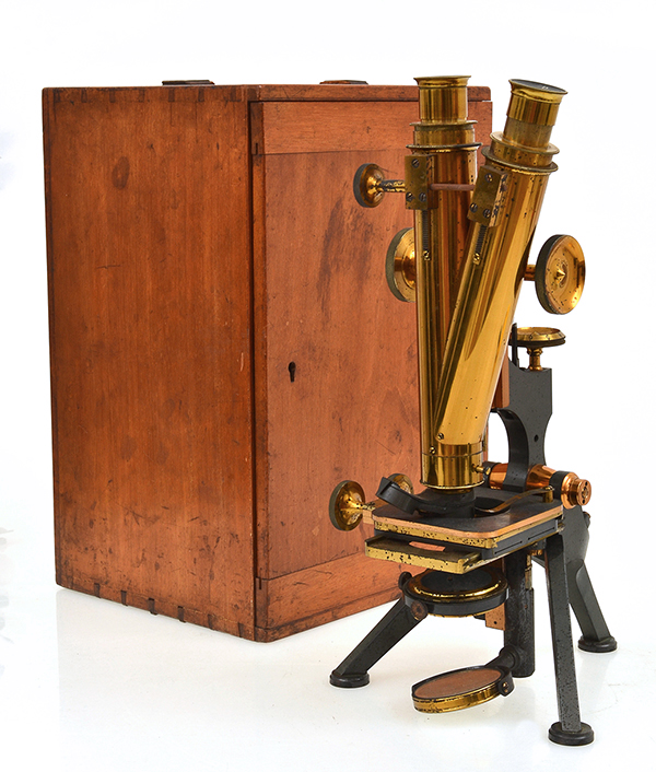 lacquered brass and steel construction with rack and pinion adjustment, fitted with two objective lenses, engraved W. Watson & Sons, 313 High Holbourn, London no. 3380 to foot, housed in portable wooden case with accessories, the microscope 32.5cm high, the case 35 x 23.5cm