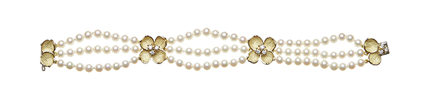 The triple strand of round pearls with stylised flower spacers, each set with a round brilliant cut diamond cluster, mounted in 18ct gold, total length 185mm, accompanied by a Tiffany & Co. box.
