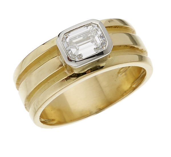The emerald cut diamond, bezel set and mounted in 18ct white and yellow gold, ring size P, circa 1995, accompanied by a Tiffany & Co. box.