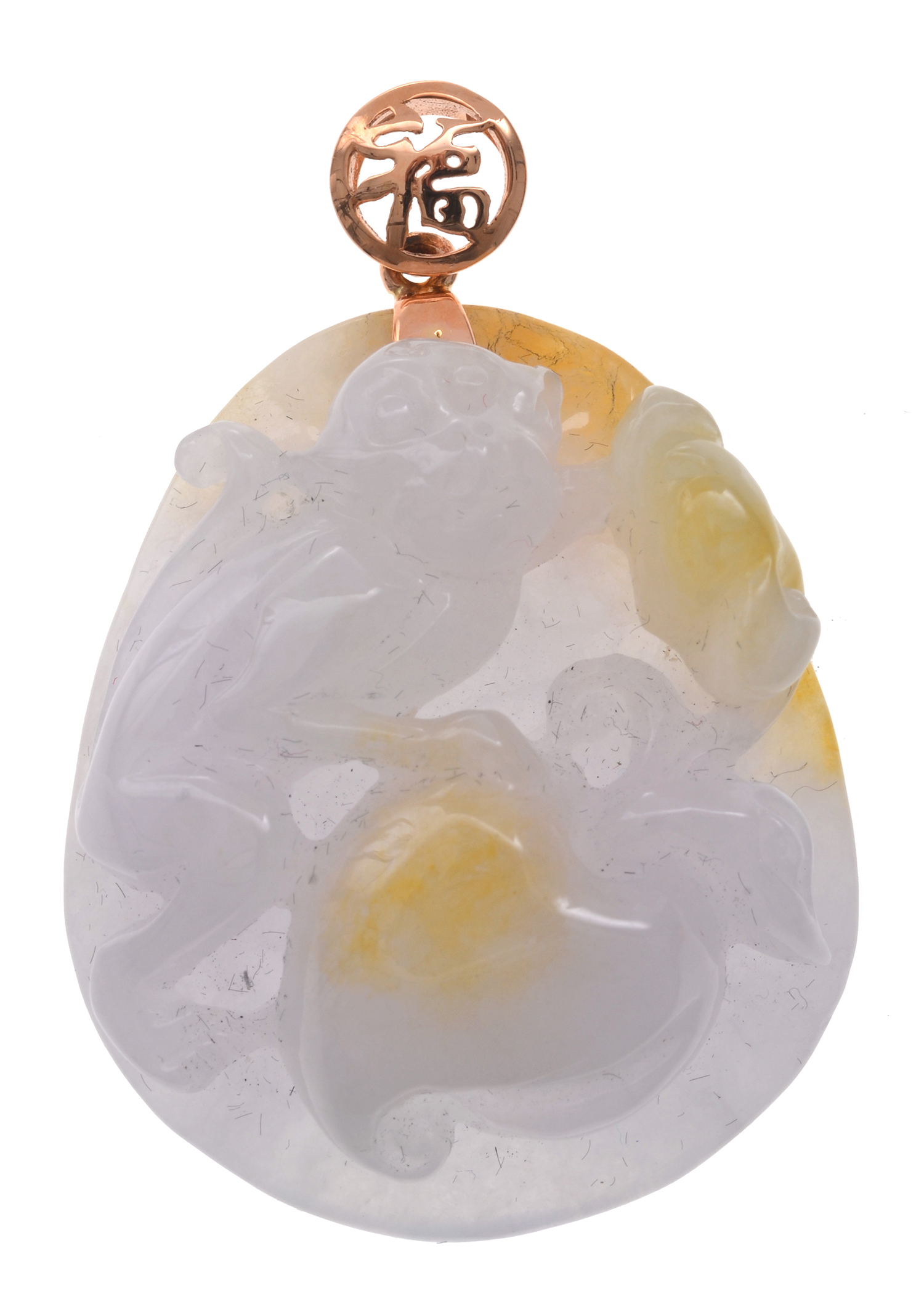 The carved jadeite depicting a monkey amongst foliage, surmounted by a pierced bale with Chinese character in 18ct gold.