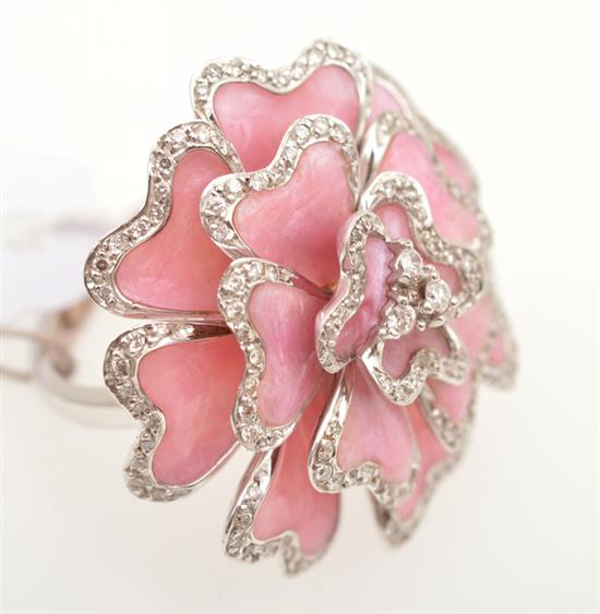 A RUSSIAN ENAMEL FLOWER STYLE DRESS RING, WITH DIAMOND DETAIL, IN 18CT WHITE GOLD