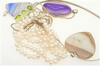 A COLLECTION OF JEWELLERY INCLUDING TWO LARGE AGATE PENDANTS AND PEARLS