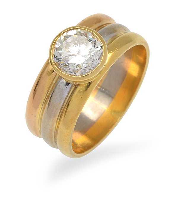 The round brilliant cut diamond of 1.75cts collet set in a tri coloured mount of 18ct gold, ring size R-S.