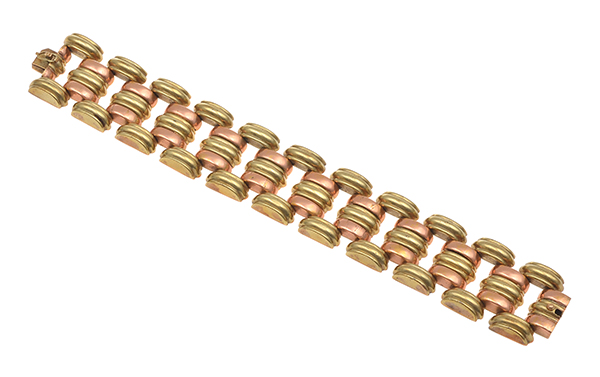 Comprising reeded and polished concave links in 14ct yellow and rose gold, total length 190mm.
