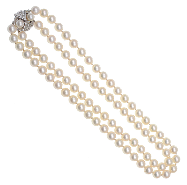Comprising a double strand of round pearls of silver and white hues measuring 8.00mm-8.40mm, to an 18ct white gold circular pearl and diamond clasp, total length 420mm.