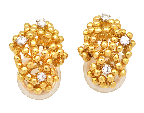 Each of sculptural design with bead finish, set with three round brilliant cut diamonds, mounted in 18ct gold.