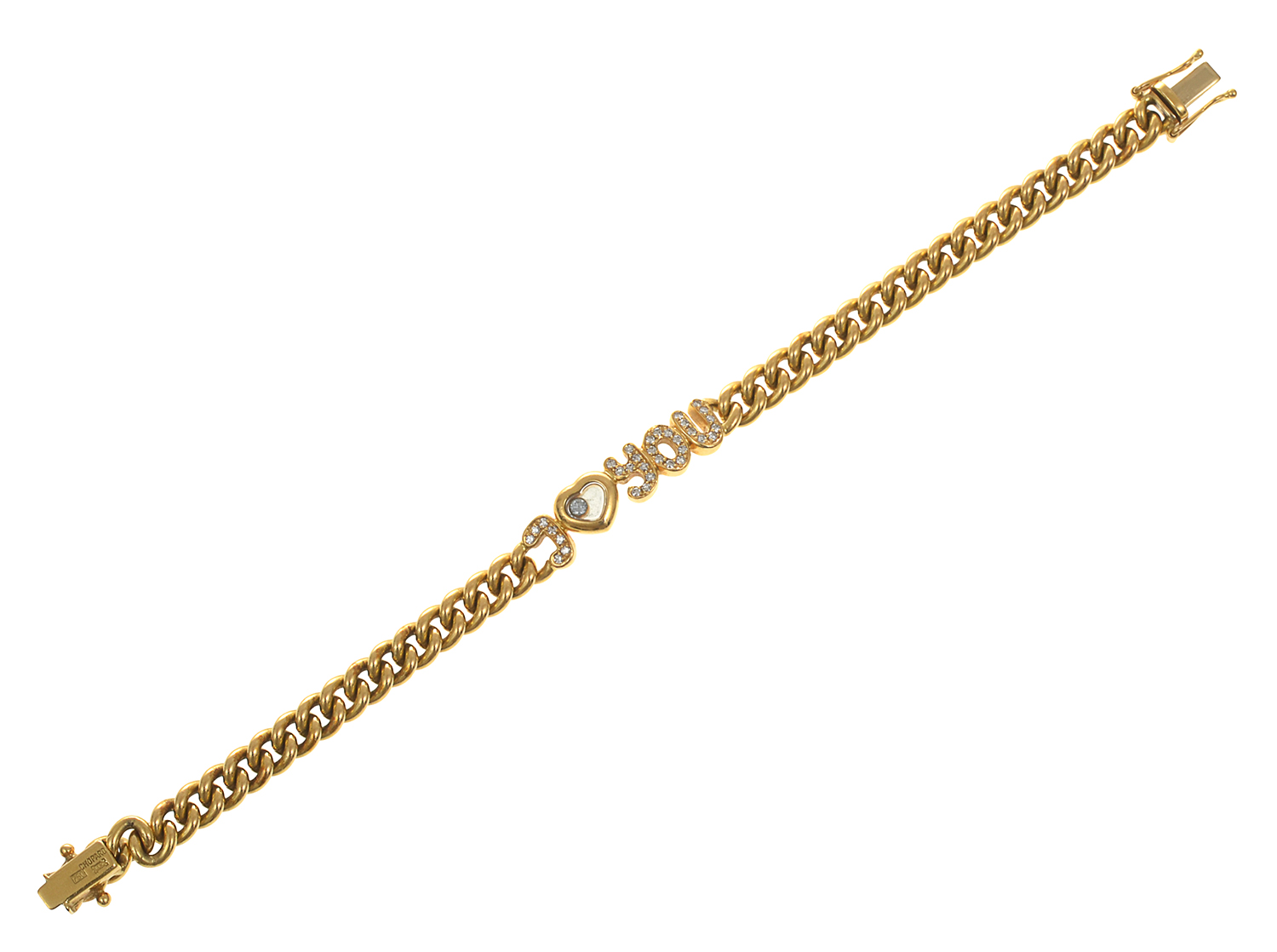 Featuring a heart shaped panel with a diamond set within, having the words I and YOU diamond set to either side, finished with curb link chain, all in 18ct gold, signed, total length 180mm.