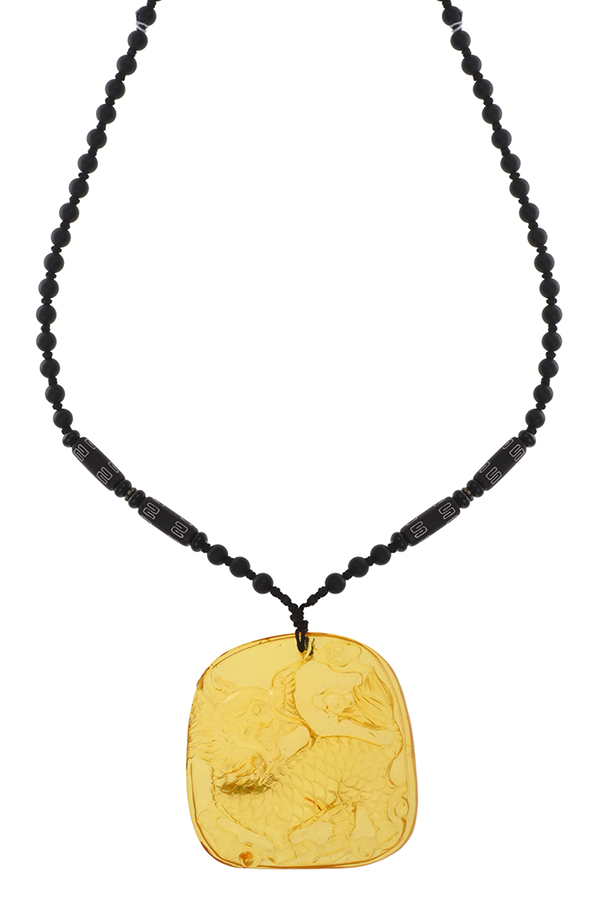 With carved dragon design, suspended from a treen and onyx bead necklace.
