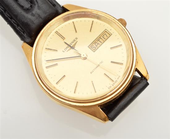 A LONGINES DAY DATE AUTOMATIC WRISTWATCH TO GOLD PLATED CASE AND LEATHER BANDS