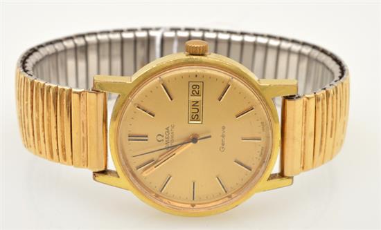 AN OMEGA AUTOMATIC DAY DATE WRISTWATCH TO GOLD PLATED CASE AND BRACELET BANDS