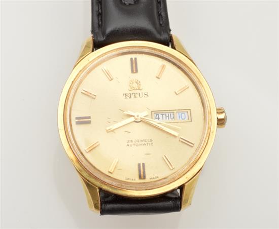 A TITUS DAY DATE AUTOMATIC TO GOLD PLATED CASE AND LATHER BANDS
