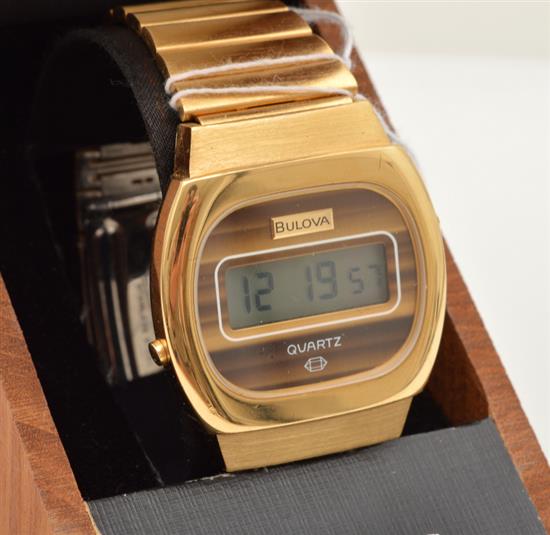 A VINTAGE BULOVA QUARTZ WITH TIGERS EYE FACE BOXED