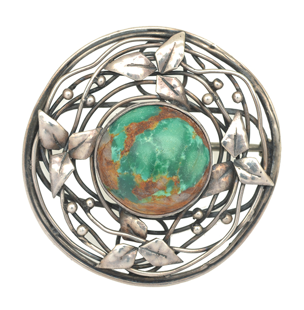 Centrally set with a round agate cut en cabochon, within a pierced circular frame with foliate and ball decoration, mounted in sterling silver, signed Wager.