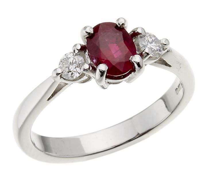 The oval cut ruby of 0.99cts, flanked by two round brilliant cut diamonds totalling 0.24cts, mounted in 18ct white gold, ring size O.