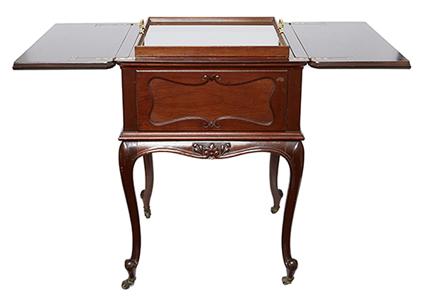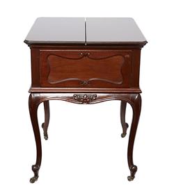 With recessed panel sides, on cabriole legs, 58cm width x 61cm depth x 79cm high.