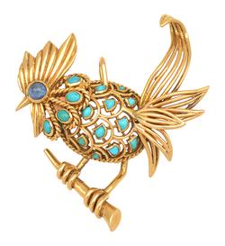 The articulated pendant modelled as a rooster, set throughout with turquoise and sapphire cut én cabochon, mounted in 18ct gold.