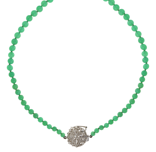 The graduated round polished beads measuring 4.95mm - 9.85mm to a circular filigree clasp set with round brilliant cut diamonds, mounted in 18ct white gold, total length 690mm.