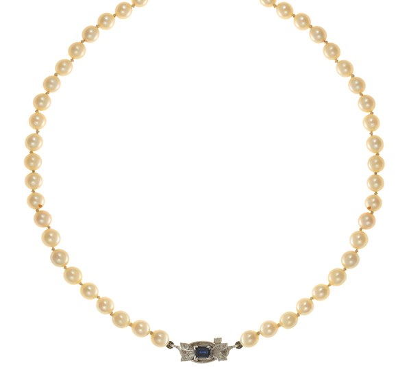 The round pearls of cream hue measuring 6.20mm to a sapphire and diamond set clasp in white gold, total length 670mm.