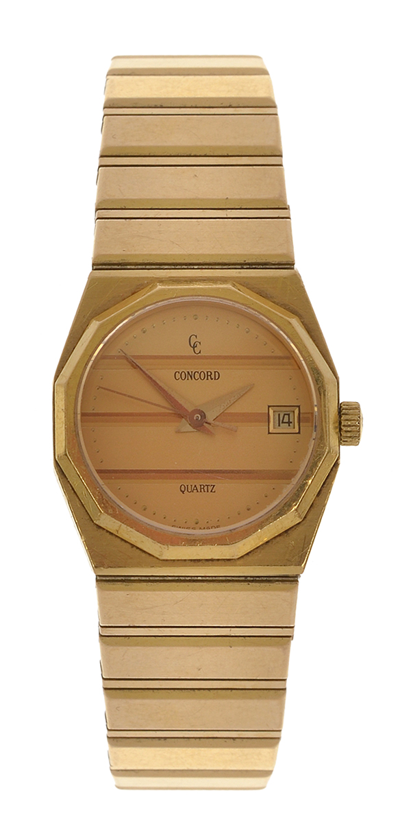 Quartz movement, circular gold dial, date aperture at three, signed case, dial and movement, 18ct gold case with conforming bracelet bands, case reference 50-73-145C47-670290, total length 180mm, 20mm diameter.