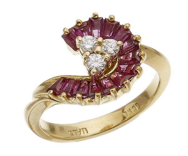 Centrally set with three round brilliant cut diamonds totalling 0.15cts, within a tapering baguette cut ruby surround totalling 0.90cts, mounted in 18ct gold, ring size J.