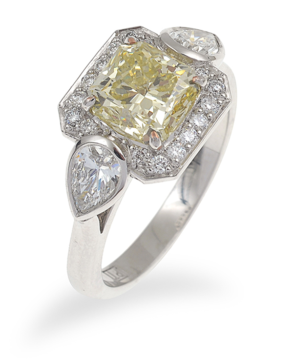 Centrally set with a radiant cut fancy yellow diamond of 2.05cts, flanked by two pear shaped diamonds totalling 0.61cts, with further diamonds to the surround, mounted in platinum, ring size L-M, accompanied by a GIA certificate stating colour fancy yellow, clarity SI2.