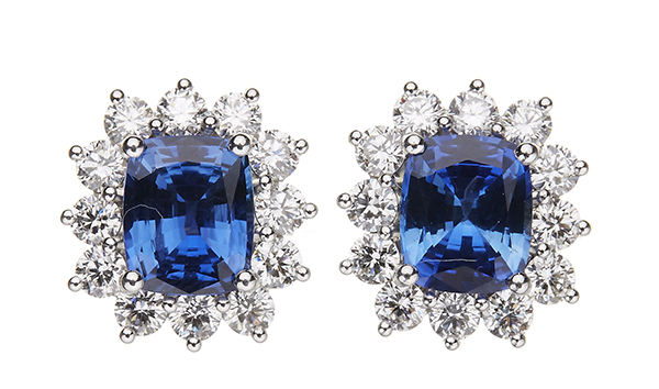 Each centrally set with an oval cut sapphire together totalling 4.79cts, surround by round brilliant cut diamonds totalling 2.26cts, mounted in 18ct white gold.