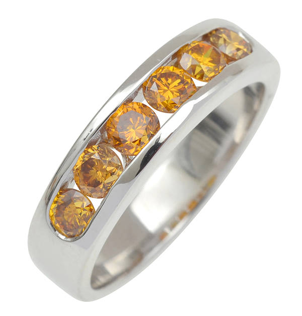 Channel set with six golden diamonds totalling 1.05ct, mounted in 18ct white gold, ring size M.